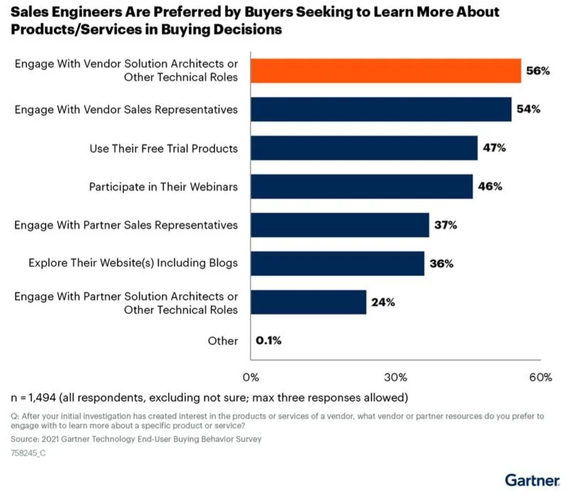 And yet in this Gartner chart from their 2021 Buyer Behavior Survey respondents rated vendor sales engineers and vendor account executives as the preferred source of information.